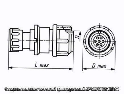 Соединитель 2РМ27КПЭ24Ш1А1 цилиндрический низкочастотный негерметичный объемного монтажа с резьбовой фиксацией сочлененного положения.
