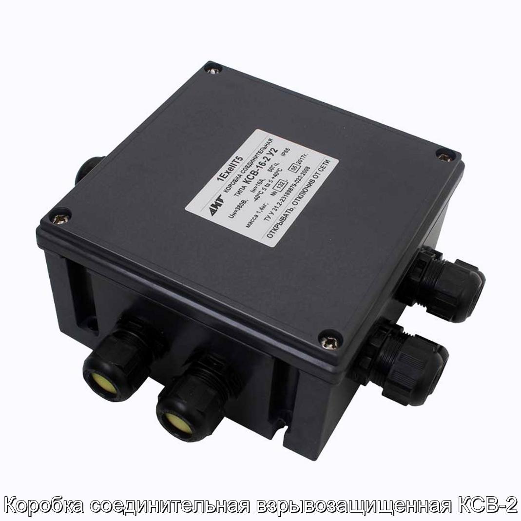 Коробка соединительная взрывозащищенная КСВ-2 предназначена для соединения и разветвления кабелей с медными и алюминиевыми жилами в силовых цепях и цепях управления постоянного и переменного тока, выполнения электромонтажных работ в помещениях со взрывоопасными условиями эксплуатации. Коробка КСВ-2 выполнена с маркировкой взрывозащиты 1ExeIIСT5 по ГОСТ 12.2.020 (ГОСТ Р 51330.0) и предназначена для эксплуатации во взрывоопасных зонах предприятий химической, газовой и нефтяной промышленности. Структура условного обозначения КСВ–ХХ–Х ХХ: