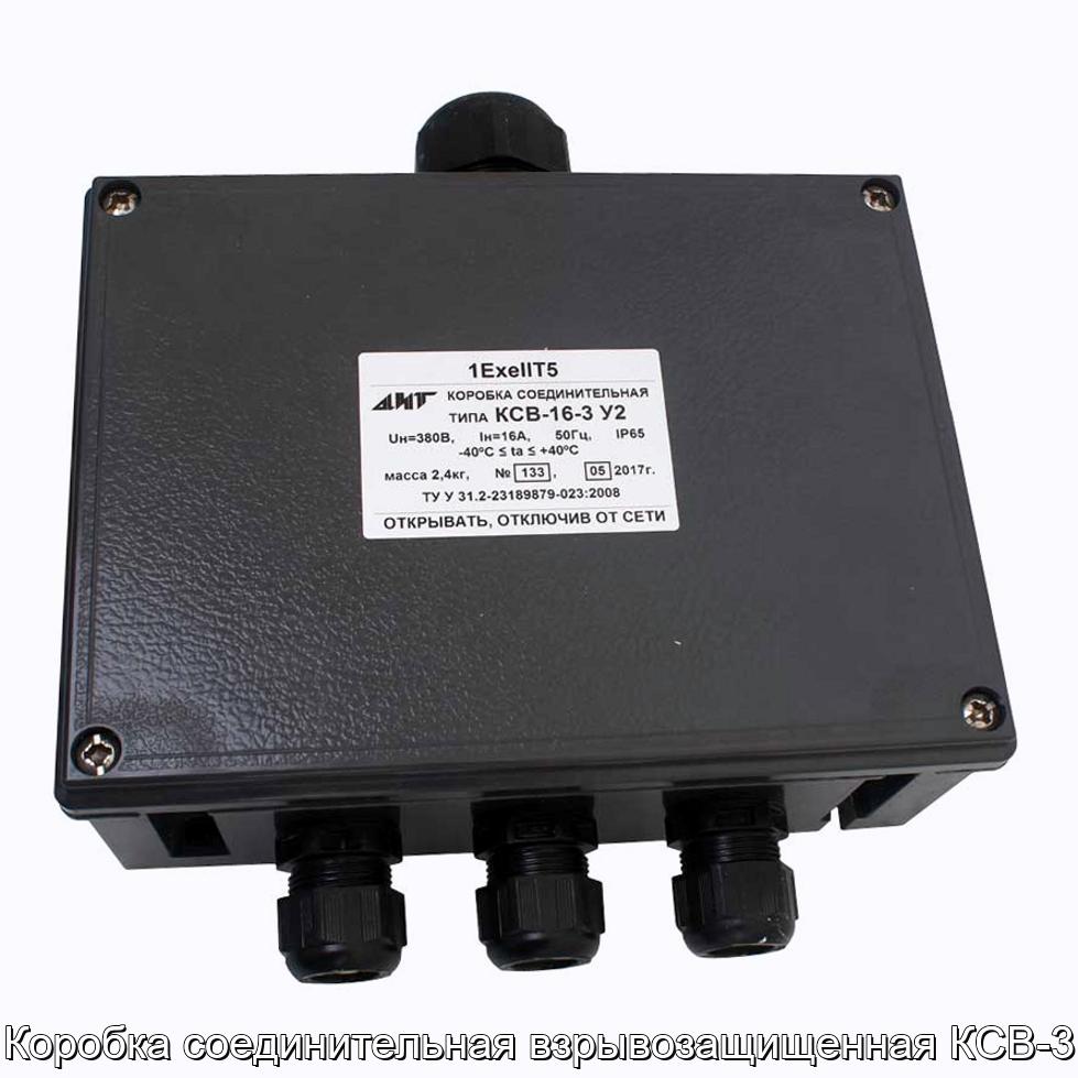 Коробка соединительная взрывозащищенная КСВ-3 предназначена для соединения и разветвления кабелей с медными и алюминиевыми жилами в силовых цепях и цепях управления постоянного и переменного тока, выполнения электромонтажных работ в помещениях со взрывоопасными условиями эксплуатации. Коробка КСВ-3 выполнена с маркировкой взрывозащиты 1ExeIIСT5 по ГОСТ 12.2.020 (ГОСТ Р 51330.0) и предназначена для эксплуатации во взрывоопасных зонах предприятий химической, газовой и нефтяной промышленности. Структура условного обозначения КСВ–ХХ–Х ХХ: