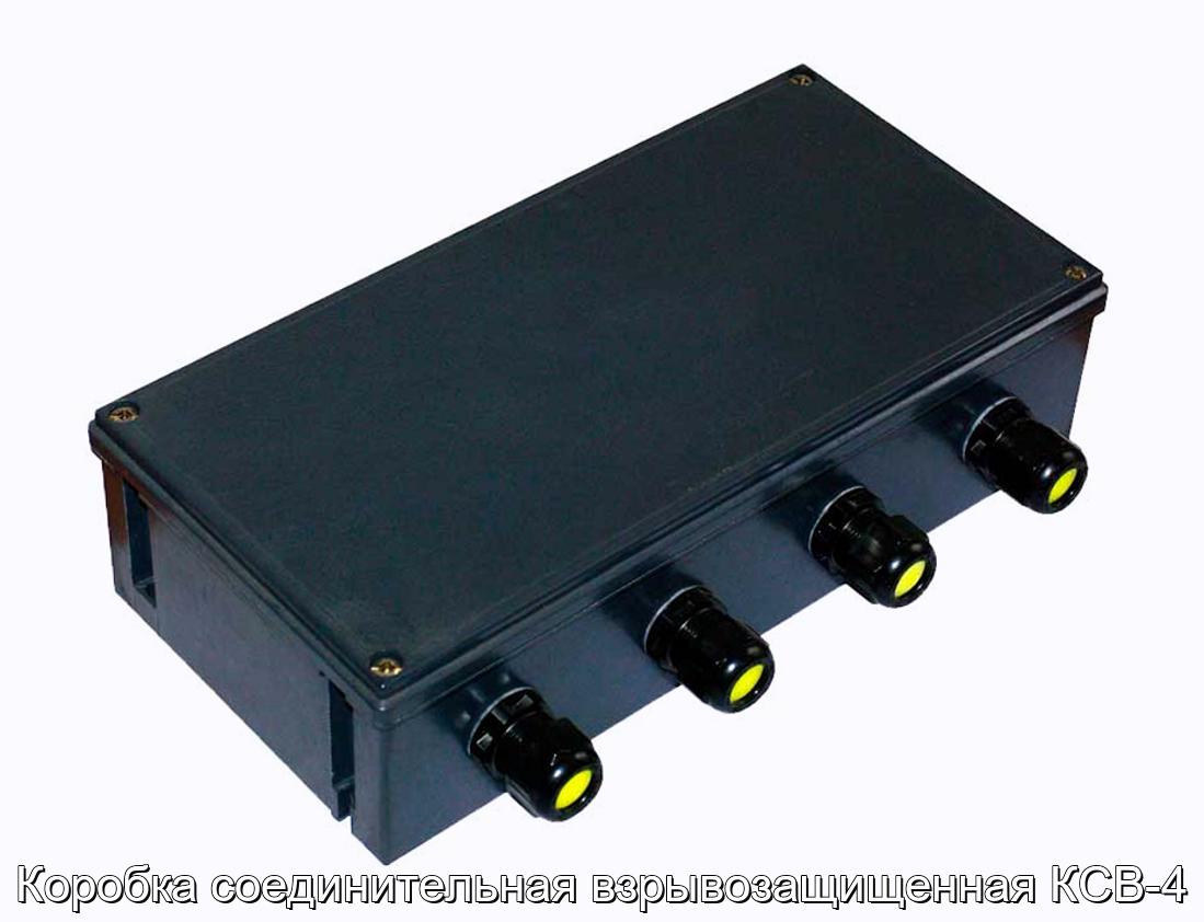 Коробка соединительная взрывозащищенная КСВ-4 предназначена для соединения и разветвления кабелей с медными и алюминиевыми жилами в силовых цепях и цепях управления постоянного и переменного тока, выполнения электромонтажных работ в помещениях со взрывоопасными условиями эксплуатации. Коробка КСВ-4 выполнена с маркировкой взрывозащиты 1ExeIIСT5 по ГОСТ 12.2.020 (ГОСТ Р 51330.0) и предназначена для эксплуатации во взрывоопасных зонах предприятий химической, газовой и нефтяной промышленности. Структура условного обозначения КСВ–ХХ–Х ХХ: