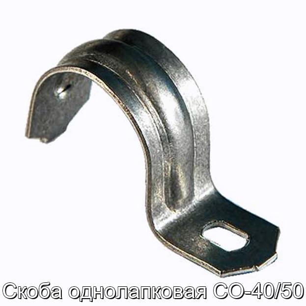 Скоба однолапковая СО-40/50 предназначена для крепления труб и кабелей при прокладке по строительным и электромонтажным конструкциям с большим количеством изгибов, при наличии одного ряда крепежных отверстий или при их расположении «по месту».